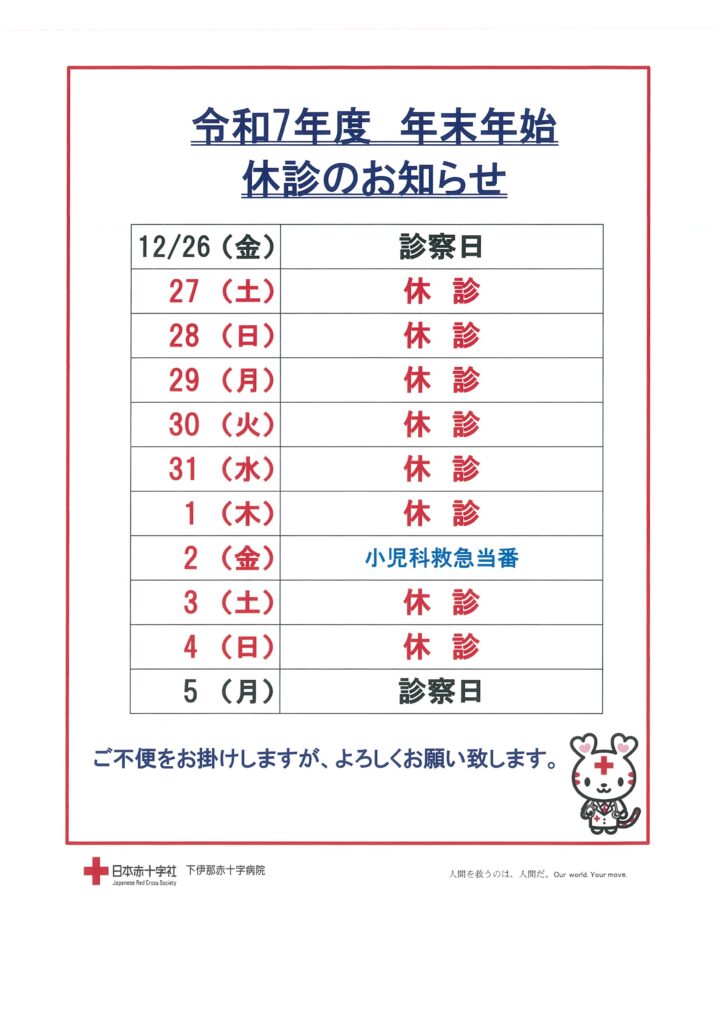 令和7年12月~令和8年1月の年末年始の休診日は、12月27日(土)~1月4日(日)です。