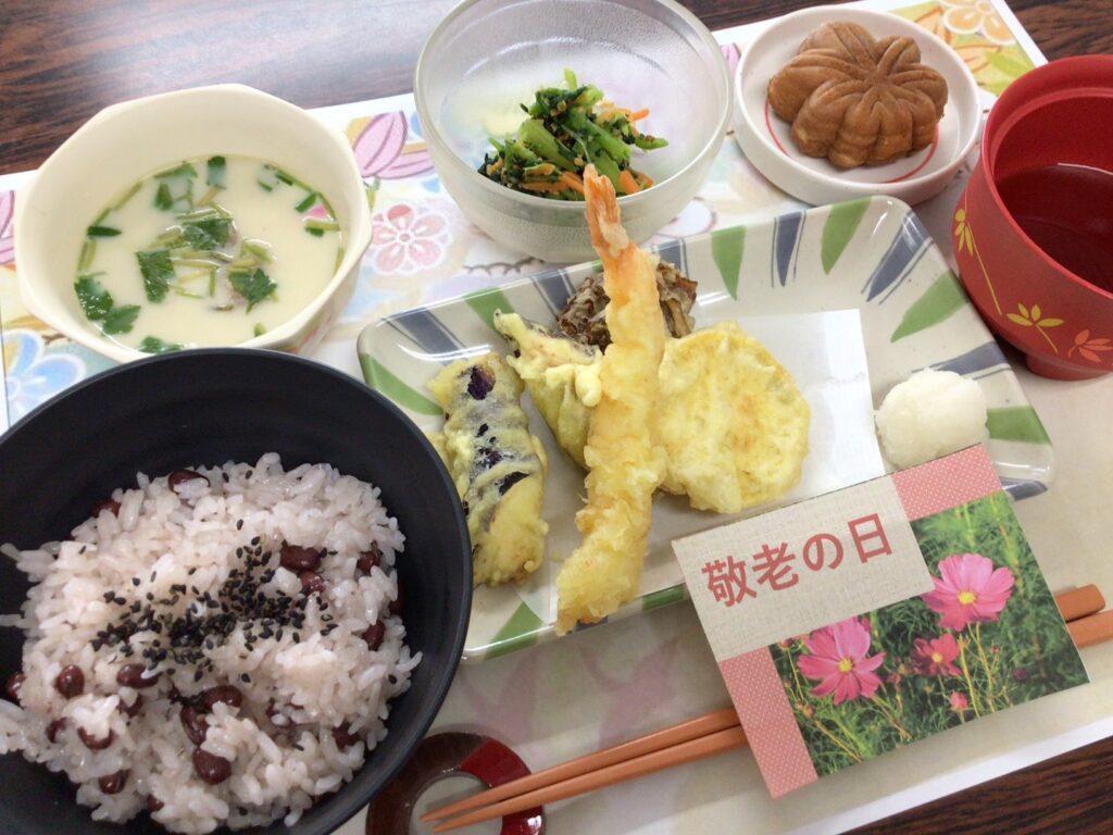 お赤飯と天ぷらをご用意しました。えびや季節食材(さつまいも、まいたけ)の天ぷらはおいしいとみなさんにとても好評でした。お赤飯も小豆粥として多くのみなさんに提供することができ喜んでいただけました。